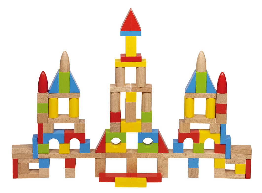 Ein bunter Mix aus Holzbausteinen lässt kleine Baumeister