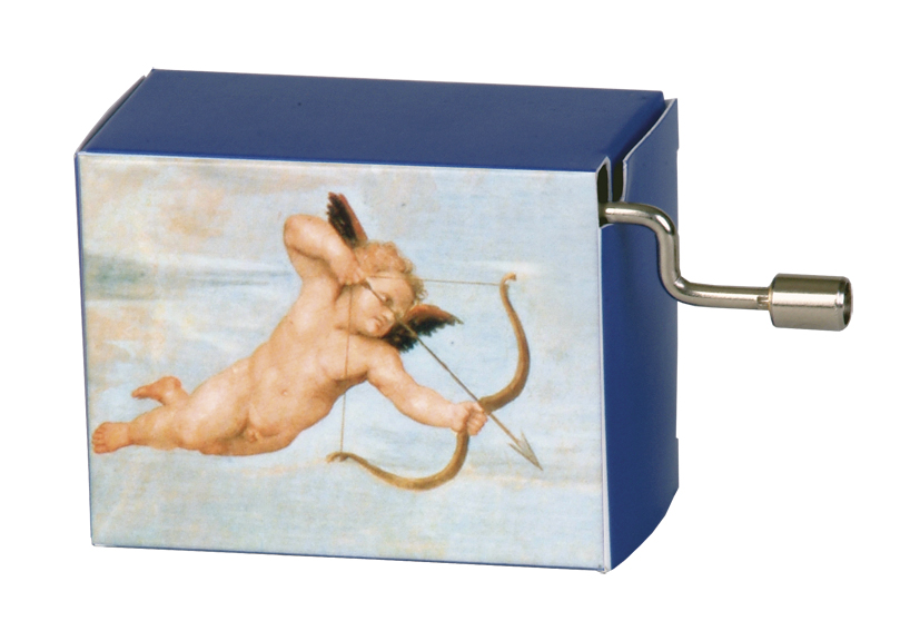 Das Spielwerk ist auf ein Resonanzplättchen aus Holz montiert. Mit ansprechender Dekorverpackung aus Pappe. Melodie: A la lune Motiv-Box: Engel mit Bogen