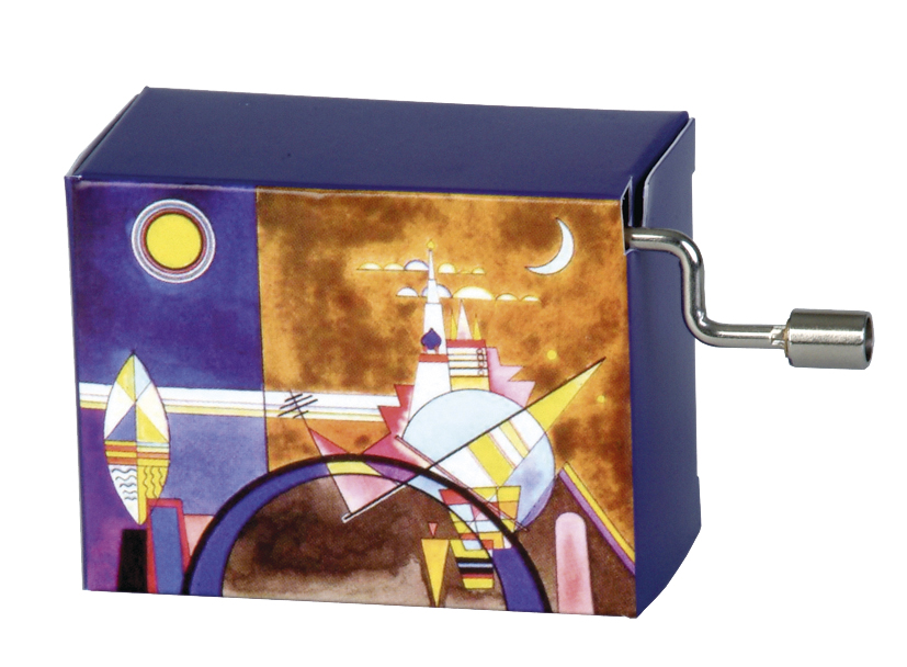 Das Spielwerk ist auf ein Resonanzplättchen aus Holz montiert. Mit ansprechender Dekorverpackung aus Pappe. Melodie: Arabesque Motiv-Box: Tor zu Kiew von Wassily Kandinsky
