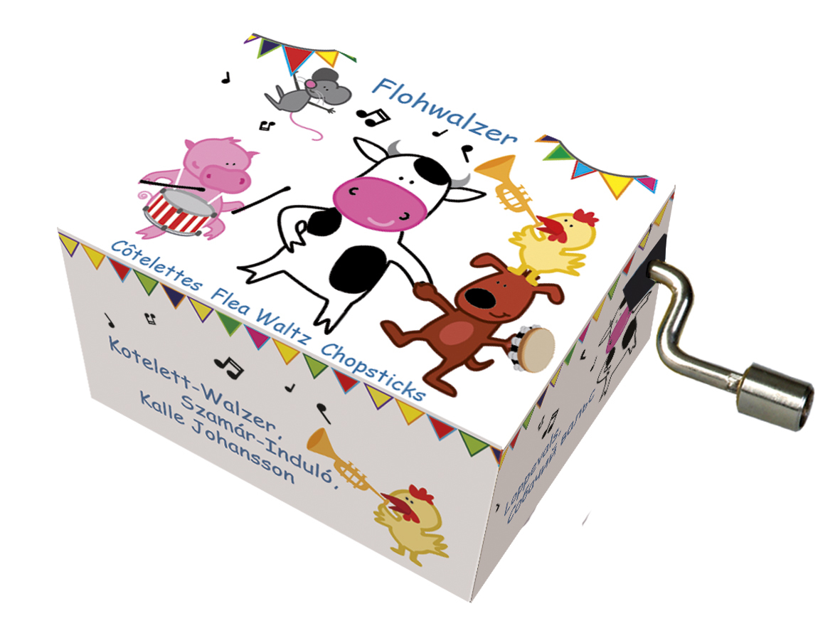 Das Spielwerk ist auf ein Resonanzplättchen aus Holz montiert. Mit ansprechender Dekorverpackung aus Pappe. Melodie: Flohwalzer Motiv-Box: Tanzende Kuh