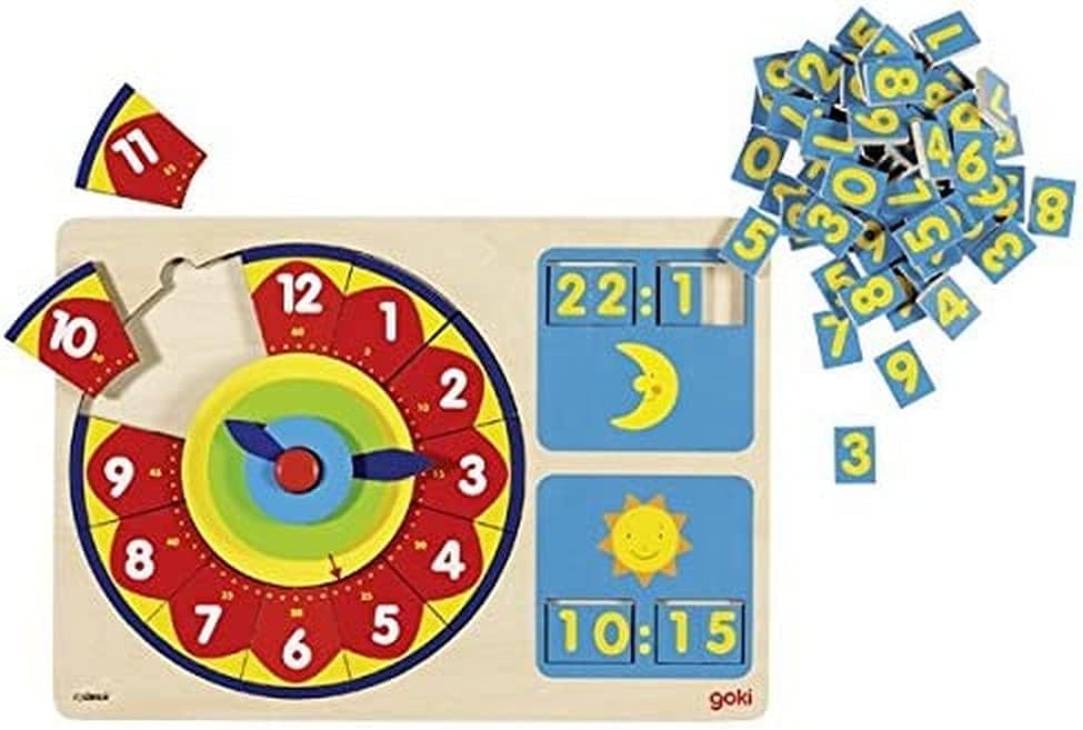 Die Ziffern der Uhr in der richtigen Reihenfolge in die Aussparungen zu legen ist eine erste Herausforderung. Nun können die Zeiger der Uhr minutengenau eingestellt werden.
