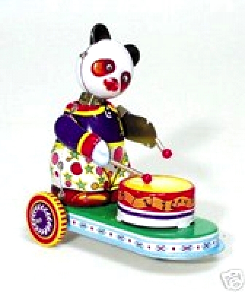Panda auf Wagen Pandabär Blech zum Aufziehen mit Trommel