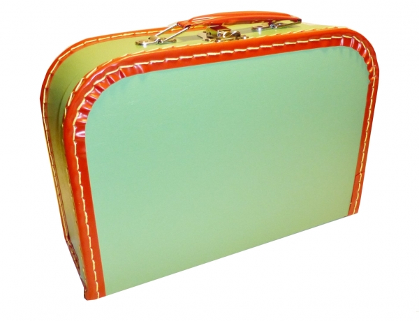 Pappkoffer hellgrün mit rotem Trim